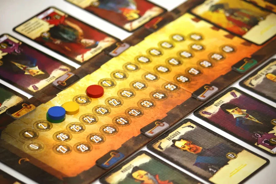 At the end of the round, if any room of the inn contains one of the police, then they conduct an investigation; if a player has any unburied victims, then he must pay 10F per victim to the local gravedigger to hurredly — and quietly — bury the bodies! Lastly in the round, any cards (accomplices) in each player’s hand must be paid 1F each. After the guest deck has been depleted the second time, players take a final round, then tally their francs. The player with the most money wins!