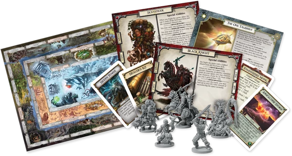 The Cataclysm introduces a new center board that opens up a reinvented, post-apocalyptic realm for your exploration. Those brave enough to inhabit this world are brought to life in the Denizens deck, while the Remnants deck fills spaces with lost treasures, broken artifacts, and the lingering after-effects of the apocalypse. Five more characters now seek the Crown of Command, including the Black Knight who once menaced the Middle Region, and four alternative endings shape your quests in this ever-changing world.
