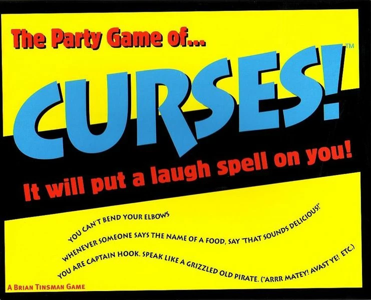 Each player starts the party game Curses! by drawing one Curse card and placing it face-up on the table. What? Curses? How can this be a party?! Ah, but these Curses are fun, not malicious, something along the lines of “You can’t bend your elbows” or “You must declare eternal love to anyone who rings the bell during this game”.