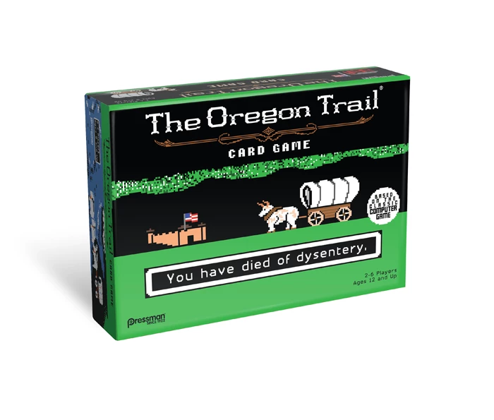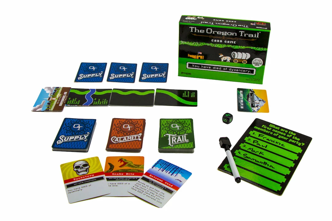 Players work together to move along the trail, fording rivers and playing Supply Cards to overcome calamities. But be warned–there will be times when it makes sense to let one of your wagon mates succumb to a calamity rather than expend precious supplies. And every time players go the way of all flesh, you’ll flip over the roster card and write their names on tombstones (don’t forget to include a quick epitaph). It’s a great way to relive your fond memories of one of the world’s most beloved computer games, and to kill off your family and friends at the same time.