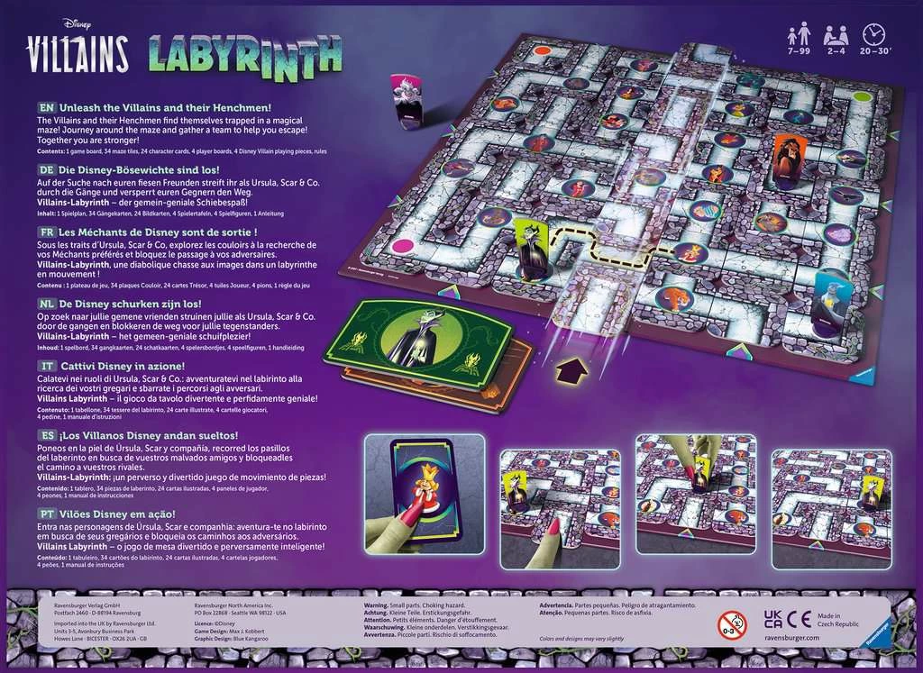 Unleash the Villains and their Henchmen! The Villains and their Henchmen find themselves trapped in a magical maze! Journey around the maze and gather a team to help you escape! Together you are stronger! In Labyrinth, Ravensburger’s hugely popular family board game, you have to find the shortest route through the Labyrinth to win! The game is for 2-4 players aged 7 and up, and the aim is to reach all your treasures and targets as you move through the Labyrinth.