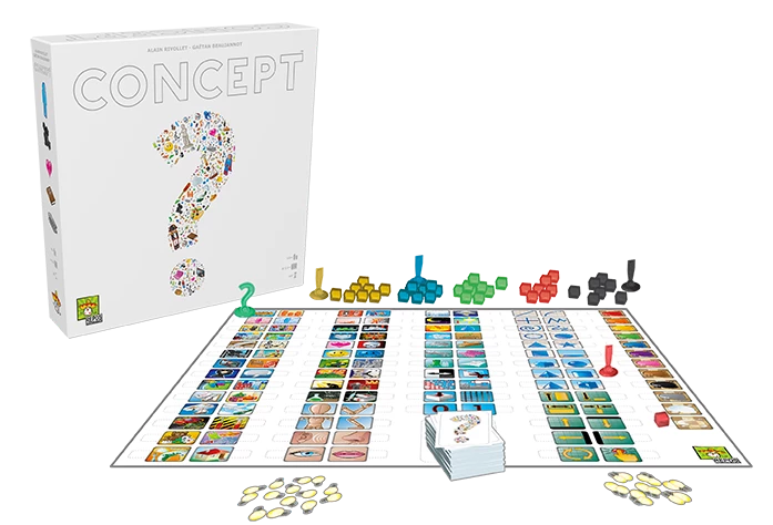 In Concept, your goal is to guess words through the association of icons. A team of two players – neighbors at the table – choose a word or phrase that the other players need to guess. Acting together, this team places pieces judiciously on the available icons on the game board.