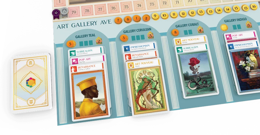 To start the game, shuffle your deck, then take five cards in hand. Fill the four galleries with 2-3 random paintings each, then place two random 3-gold cards (each with a special power) in the bank, along with the deck of 5-gold cards. Paintings in galleries cost 1-8 gold, while gold cards cost 5 or 8 gold. On a turn, take two actions from these three choices, repeating an action, if desired: