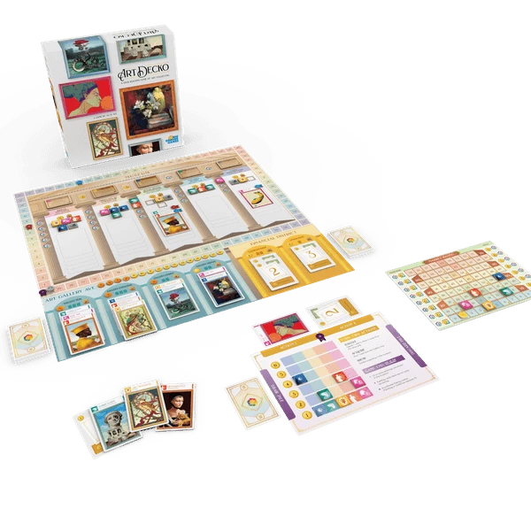Art Decko, first released as Promenade, is a light strategy game for 2 to 4 painting collectors in which you try to create a valuable deck of gold and painting cards over the course of play. These cards — gold and paintings — both count as currencies in the game, and you can use them to purchase more paintings, acquire more gold, and pay for exhibition space in a museum. Your long-term goal is to manipulate the market value of certain styles of artwork, while also earning points by placing paintings in the museum.