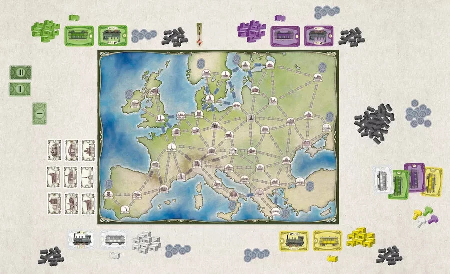In Free Ride, you are one of several people in charge of building railway lines, connecting the cities in Europe, and carrying passengers to those cities. The game board shows 45 cities connected by a network of potential routes, and all railway lines built will be one of three types: lines owned by you, lines owned by fellow players, and state-owned lines. When you travel along railway lines, you pay nothing to travel on your lines and state-owned lines. To travel on a fellow player’s line, however, you must pay them 1 coin, which converts their line to state-owned. From then on, traveling on that line is free for all players. As coins are limited, you should carefully balance the building of your lines with the conversion of fellow players’ lines to state-owned lines.