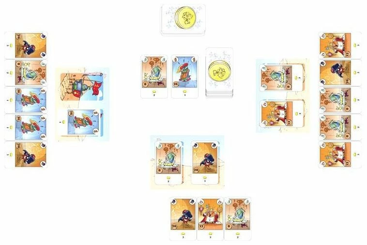 As soon as a player has the proper number of bean cards in order in one of her fields, she harvests them, placing these cards in the discard pile and collecting a Taler from the stack. If those cards covered beans of another type, she can then start building on those beans again. After going through the deck 1-3 times (depending on the number of players), the game ends and whoever has the most Talers wins.