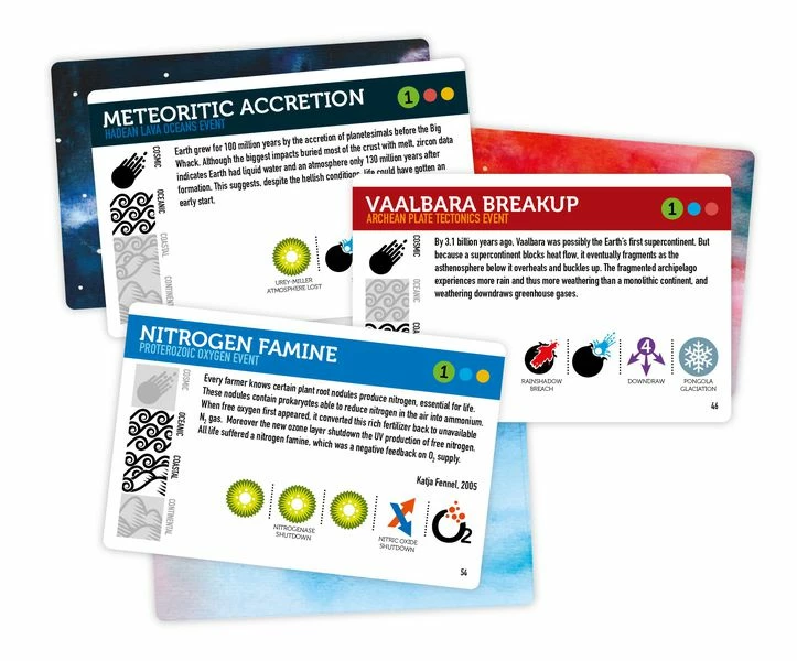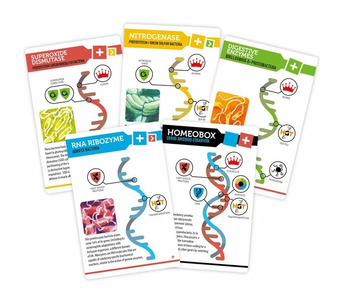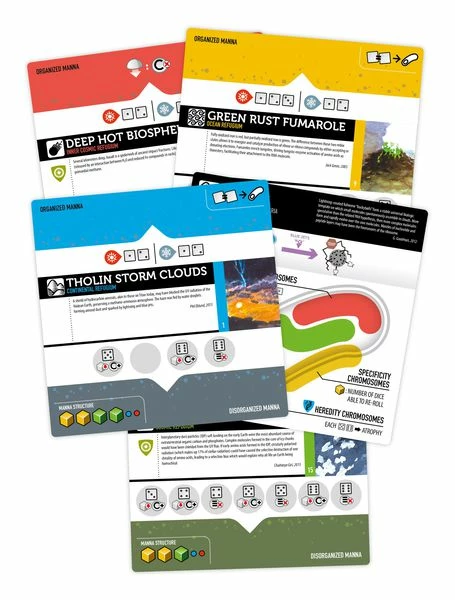In Bios: Genesis, one to four players start as organic compounds shortly after Earth’s formation, represented by up to three Biont tokens. The Amino Acids command Metabolism, the lipids create cells, the pigments control energy absorption and storage, and the nucleic acids control templated replication. Their goal is a double origin of life: first as Autocatalytic Life (a metabolic cycle reproducing, yet not replicating, its own constituents), and the second as Darwinian Life (an Organism using a template to replicate in an RNA world). Players can play cooperative, competitive, or solitaire.