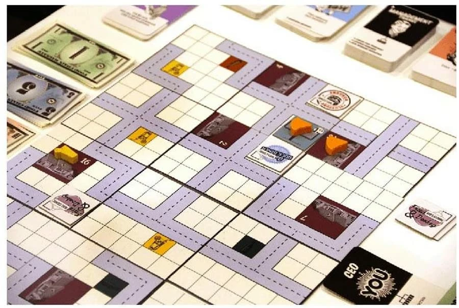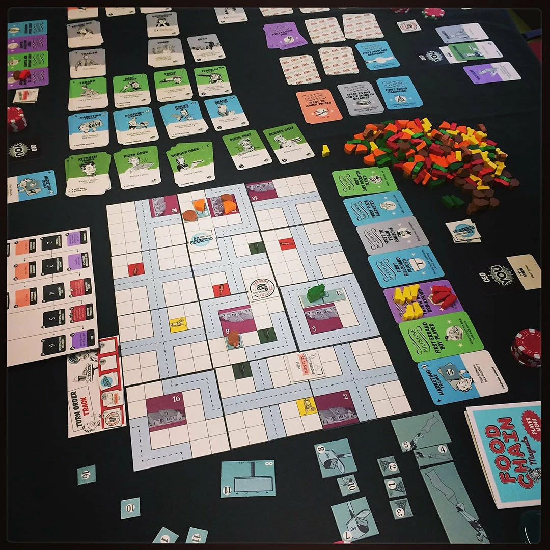 Food Chain Magnate is a heavy strategy game about building a fast food chain. The focus is on building your company using a card-driven (human) resource management system. Players compete on a variable city map through purchasing, marketing and sales, and on a job market for key staff members. The game can be played by 2-5 serious gamers in 2-4 hours.