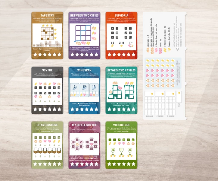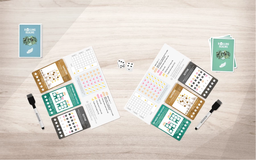 In Rolling Realms, players compete to earn the most stars in a series of minigames over 3 rounds. This is a roll-and-write game, meaning that players will write on the game components using dry-erase markers.