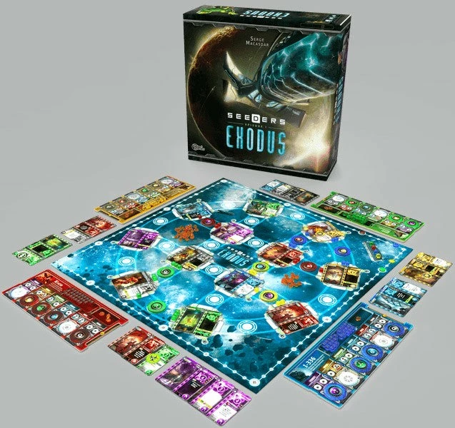 Seeders from Sereïs – Episode 1: Exodus is the first game of a serial of ten set in this universe. When an unknown force threatens to render their home uninhabitable, the Seeders must build arks — giant colony ships — to ensure their survival. Players work to create the most promising design to be chosen for production. Each turn players draft cards into their hands as cards are laid out on the board. Players strategically place negotiator chips between the cards they want, using their alignment and position to determine who has the most influence over a desired card. Once all negotiators and tokens are placed, influence is calculated and the winners of each card is determined.