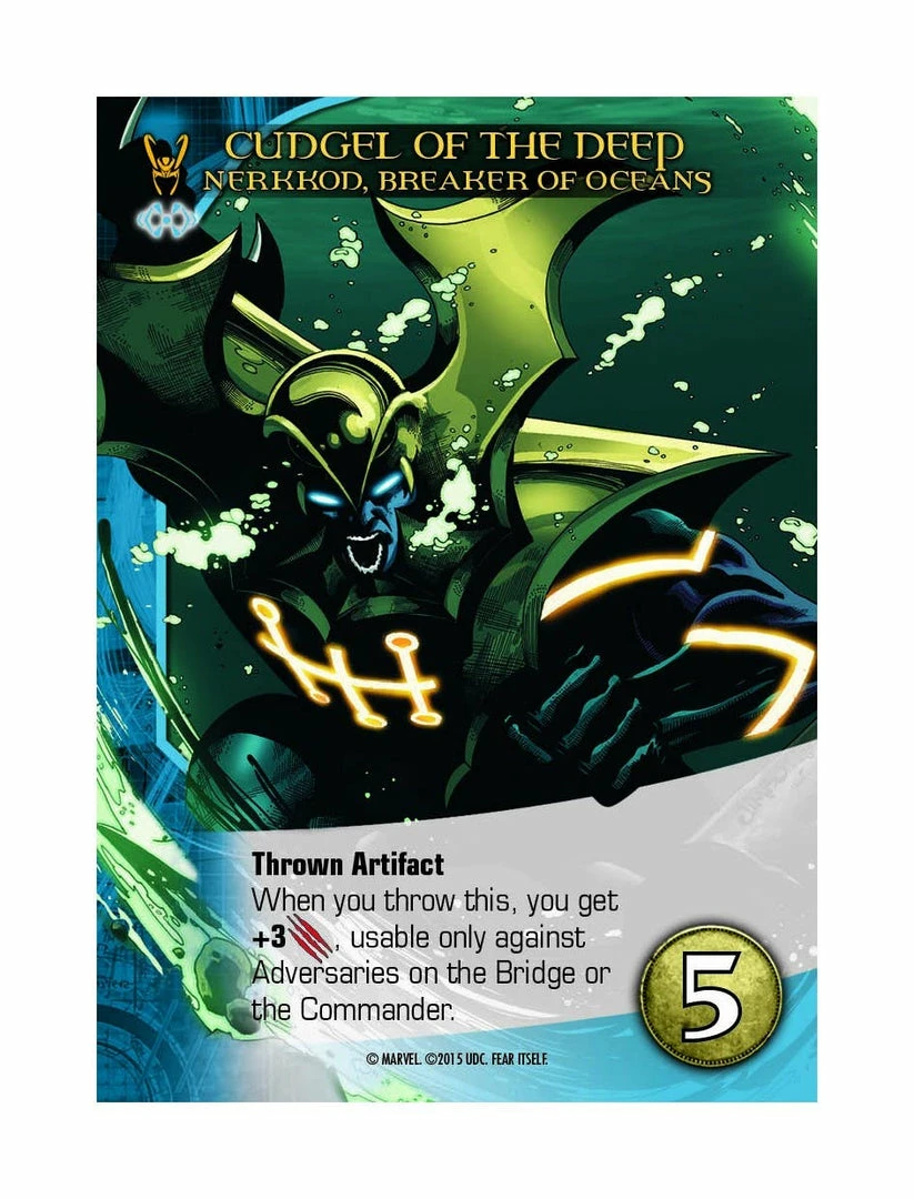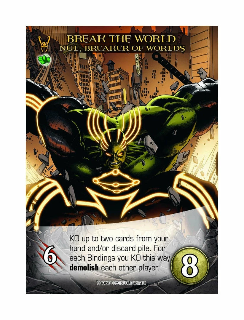 With the Legendary Villains: Fear Itself expansion for Legendary and Legendary: Villains, you can play through the “Fear Itself” storyline from Marvel Comics. This expansion consists of six new allies from The Worthy: Kuurth, Nul, Skirn, Nerkkod, Greithoth and Skadi; one new adversary group; one new commander; and three new plots.