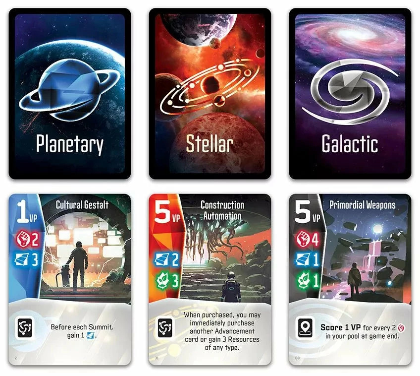 Each round, you’ll choose one of four actions to perform at a Summit: collecting one of 3 types of resources or purchasing Advancements. In a rock-paper-scissors fashion, you will compare your chosen action to the actions chosen by your left and right neighbors. Win against one or both of them, and you’ll collect 2 of your chosen resources. Tie and you’ll gain 1. Lose, and you gain nothing. If you chose instead to Advance, you won’t get any resources (and your neighbors will each gain 2 of their chosen resource), you will be able to purchase an Advancement card which will give you VPs and allow you to start building your engine. The game ends once one player reaches 25 or more VPs, and the player with the most points is the winner!