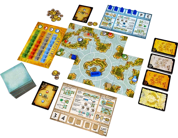 In Akrotiri — which combines tile placement, hand management, and pick-up and delivery — players place land tiles in order to make the board match the maps that they have in hand. Players excavate temples; the ones that are harder to find and the ones further away from Thera are worth more towards victory, but the secret goal cards keep everyone guessing who the victor is until the end! May the gods forever bless you with favorable winds!