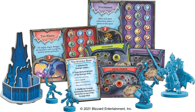In World of Warcraft: Wrath of the Lich King, players journey to the frozen continent of Northrend to face the armies of the Lich King. This “Pandemic System” game showcases familiar mechanisms and gameplay, now tweaked to embrace the setting of the Wrath of the Lich King. Forts, temples, battlegrounds, and more populate the game board as you and your fellow heroes journey across the cold landscape. Along the way, you’ll set up strongholds, complete quests, and do battle with legions of undead.