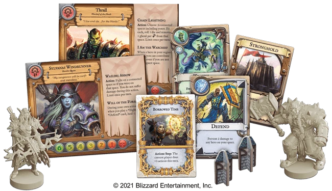 In more detail, players team up as legendary heroes from across Azeroth, each with their own unique abilities to help in and out of combat. Heroes such as Thrall, Warchief of the Horde; Varian Wrynn, King of Stormwind; Sylvanas Windrunner, Banshee Queen of the Forsaken; and many more are at your fingertips. As the Scourge grows, more undead will populate the board. Throw dice as you enter into battle against the hordes of ghouls and ferocious abominations, using hero cards to add power to your attacks, block incoming assaults, heal wounds, take mounts to far off spaces, and so much more.