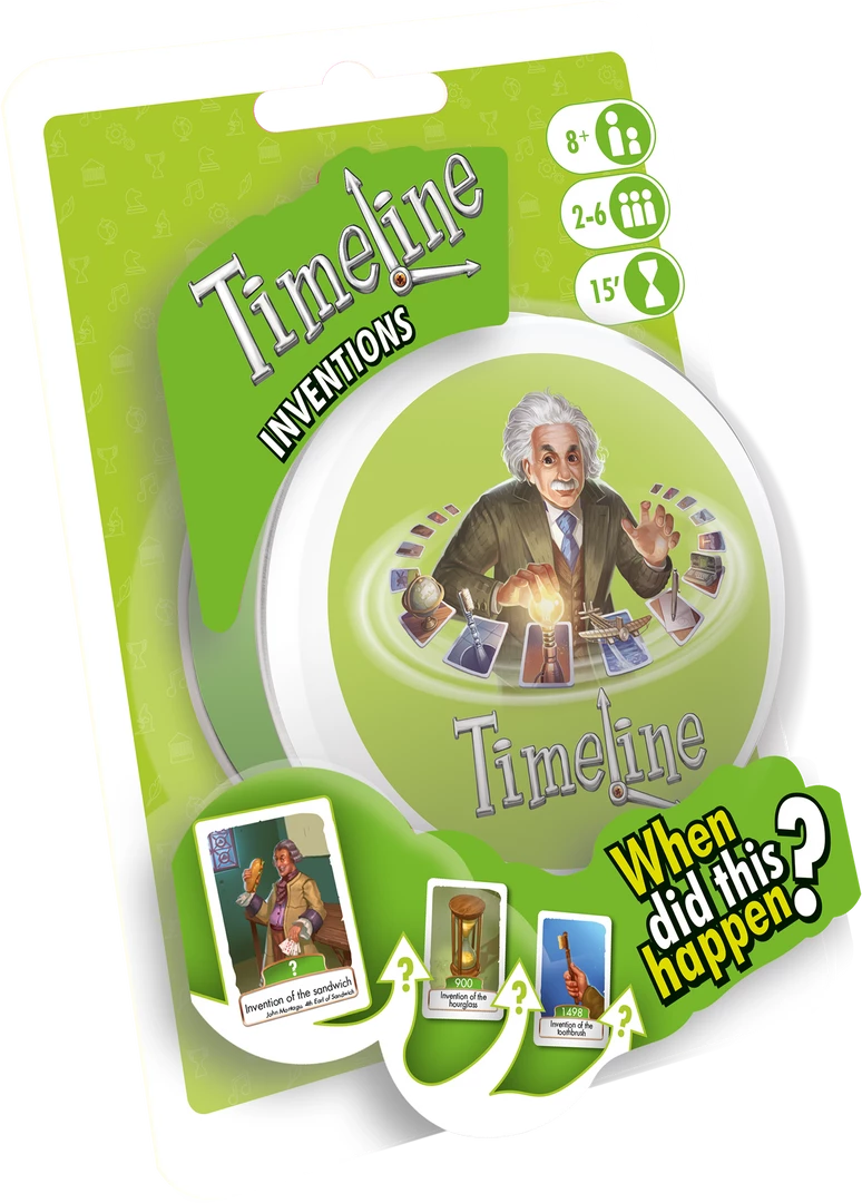 Timeline: Inventions is a card game played using 55 cards. Each card depicts an invention on both sides, with the year in which that invention was created on only one side. Players take turns placing a card from their hand in a row on the table. After placing the card, the player reveals the date on it. If the card was placed correctly with the date in chronological order with all other cards on the table, the card stays in place; otherwise the card is removed from play and the player takes another card from the deck.
